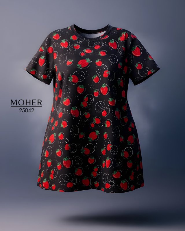 طرح توتفرنگیهای رنگی روی زمینهی مشکی، جلوهای پرنشاط و فانتزی به استایل خانگی شما میبخشد. طراحی آزاد و تنخور راحت این تونیک باعث میشود برای استفادهی روزمره، مهمانیهای دوستانه یا حتی استایل خانگی شیک انتخابی ایدهآل باشد.
