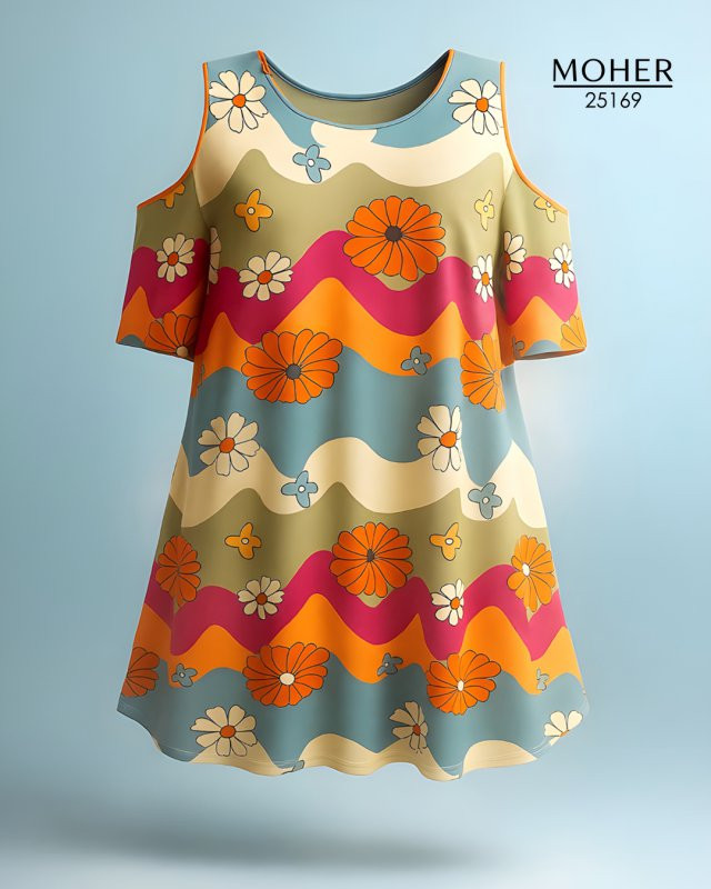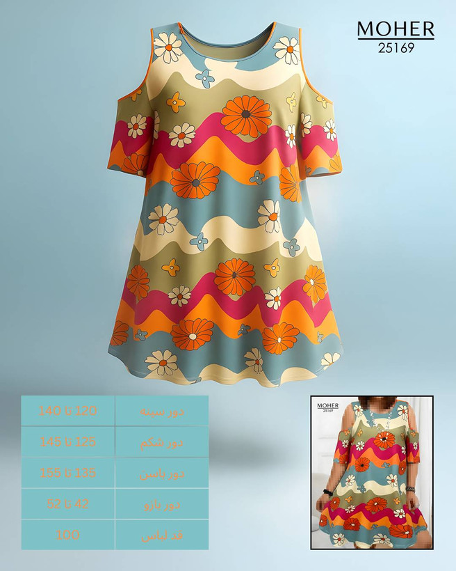 طرح خاص و چشمنواز: ترکیب رنگهای زرد، نارنجی، آبی، کرم و سرخابی در کنار گلهای بزرگ، جلوهای زنده و جذاب به لباس داده است.