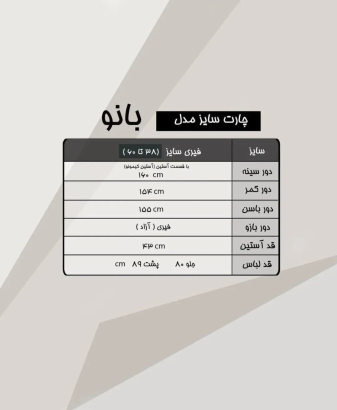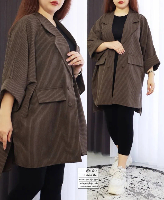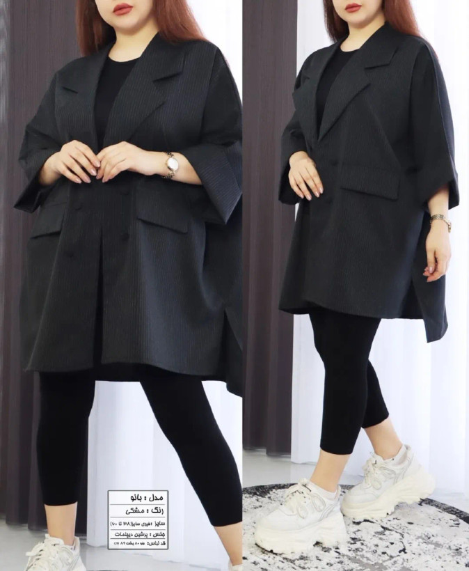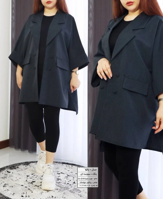 مانتو سایزبزرگ جنس : پرشین دیپلمات رنگ بندی : سورمه ای, طوسی, قهوه ای, کالباسی, مشکی سایز ها : فیری سایز 38 تا 60 با ارسال حدود قد : جلو ۸۰ پشت ۸۹ جیب ها نما هستند زمان ارسال فوری