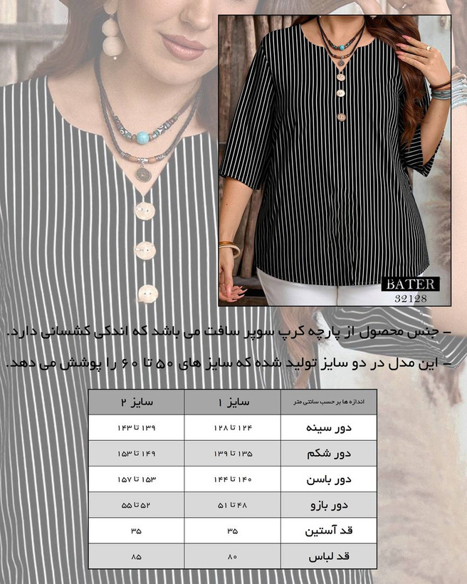 ♦️سایزبندی : این شومیز در دو سایز تولید شده که مناسب ۵۰ تا ۶۰ می باشد