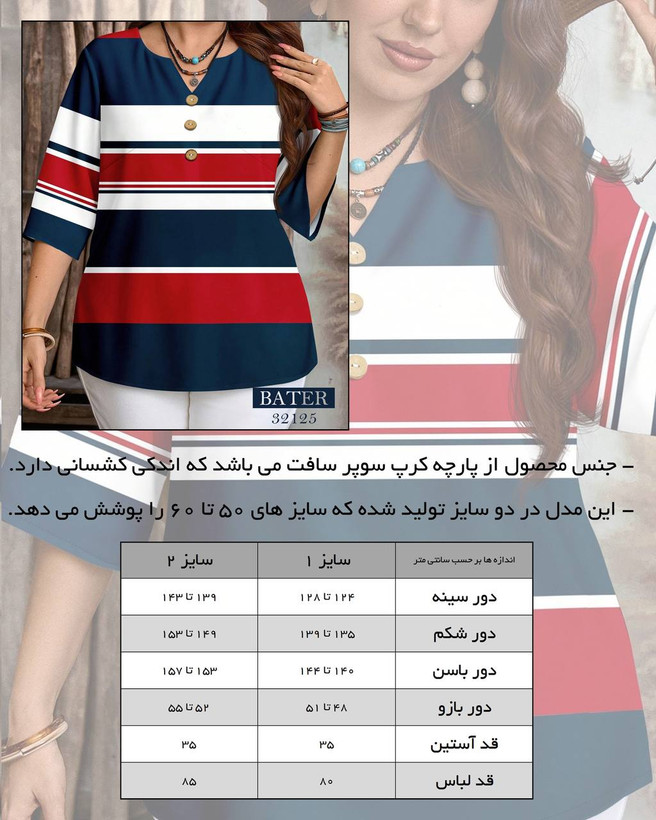 ♦️سایزبندی : این شومیز در دو سایز تولید شده که مناسب ۵۰ تا ۶۰ می باشد